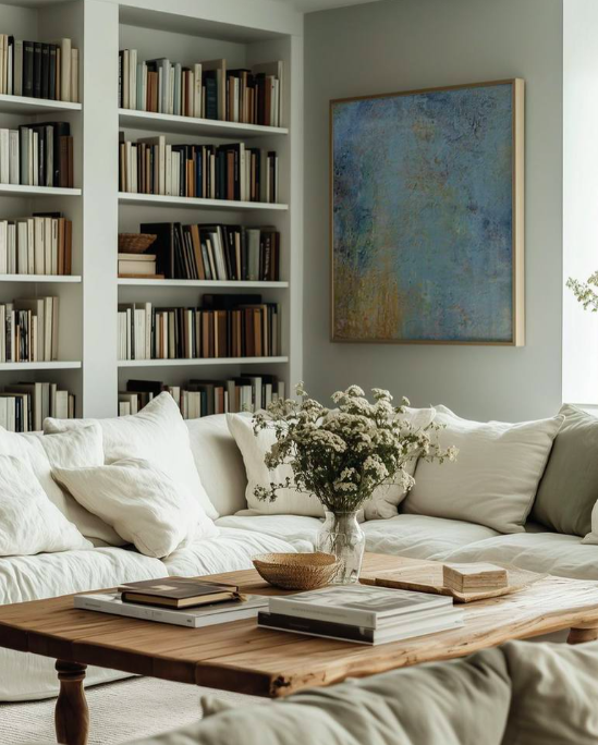 /A Living room with the healing aura of Coming Home to My Well Being, 24” x 30” x 1.5” Mixed Media on Wood Panel, © Deb Chaney Prints available on Saatchi Gallery.