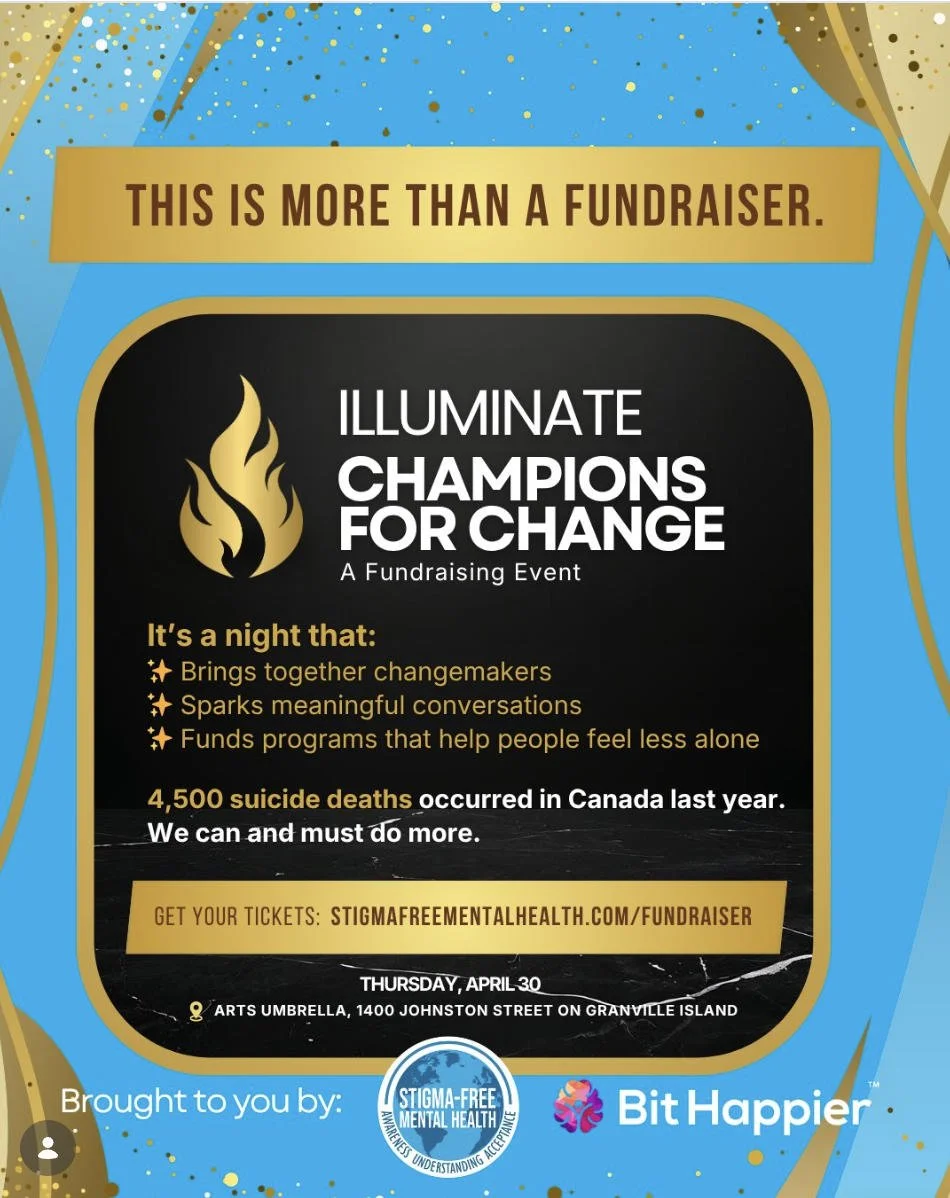 On April 30th, at Arts Umbrella on Granville Island, this special fundraising evening will bring together community leaders, organizations, and supporters who are committed to improving mental health and addressing loneliness in our communities. Hosted by Bit Happier in collaboration with the Stigma-Free Mental Health Society, the event is focused on something that touches all of us—connection, well-being, and the courage to speak openly about mental health.