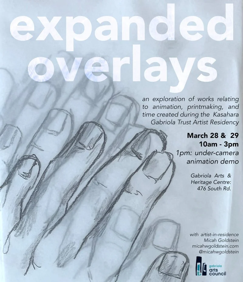 Expanded overlays was an exploration of works relating to animation, printmaking, and time created during the Kasahara Gabriola Trust Artist Residency. Artist-in-residence Micah Goldstein shared some of the work she's been developing while on the island, as well as a short under-camera animation demonstration using paint on glass. Micah's work was displayed both as individual frames and as full animated sequences.